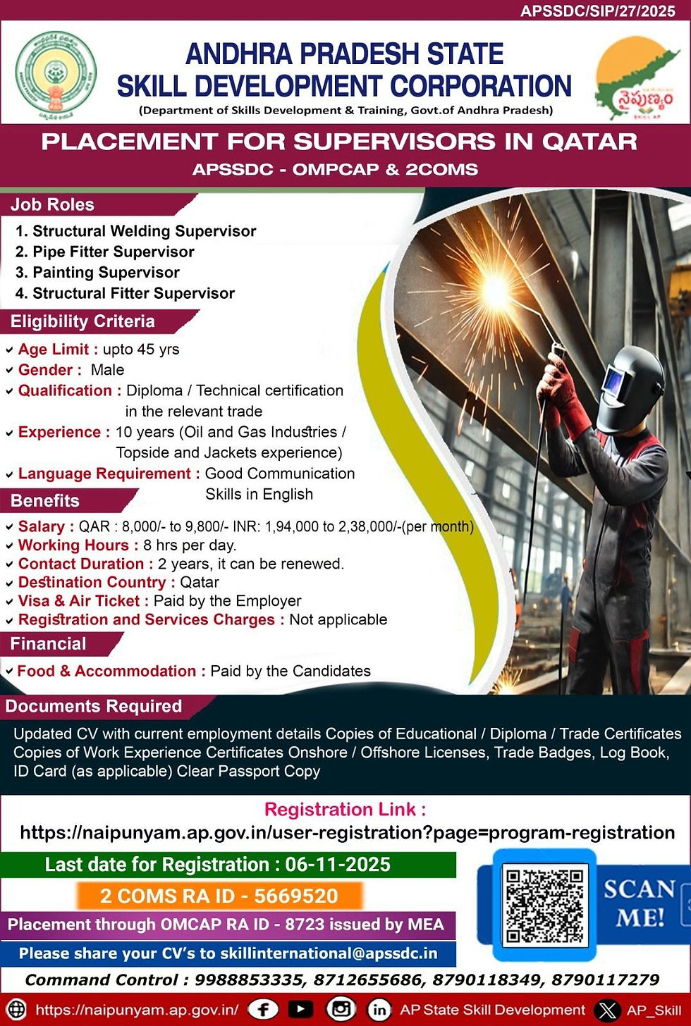 APSSDC Qatar Jobs 2025, Overseas Jobs for Andhra Pradesh candidates, Qatar Supervisor Recruitment, APSSDC Overseas Placement, Structural Welding Supervisor Jobs, Pipe Fitter Supervisor Vacancy, Painting Supervisor Jobs in Qatar, Structural Fitter Supervisor 2025, Andhra Pradesh Skill Development Corporation Jobs, APSSDC job notification 2025, Andhra Pradesh Overseas jobs, APSSDC Gulf Jobs 2025, Qatar job notification Telugu, Qatar Supervisor job apply online, Oil and Gas industry jobs, Topside and Jackets experience jobs, Diploma Technician jobs in Qatar, Qatar recruitment for Indians, 2COMS overseas recruitment, OMCAP job notification, APSSDC international placements, Free visa and air ticket jobs, Food and accommodation paid jobs, Andhra Pradesh government job abroad, AP Skill Development overseas opportunity, 2025 Qatar Supervisor vacancies, Andhra Pradesh private overseas jobs, High salary jobs in Qatar, Gulf supervisor recruitment, 10 years experience jobs abroad, Oil and gas supervisor positions, APSSDC jobs for diploma holders, Qatar mechanical supervisor jobs, Supervisor openings abroad, naipunyam registration link, Apply online APSSDC Qatar, Overseas job fair APSSDC, Gulf job notification 2025, Qatar recruitment from Andhra, Skilled worker jobs abroad, Supervisor jobs with experience, APSSDC international job fair, Engineering supervisor Qatar, Telugu job information website, Latest overseas notification 2025, Qatar employment for Indians, Free recruitment abroad APSSDC, Technical supervisor Gulf jobs, Naku Oka Job Kavali overseas updates